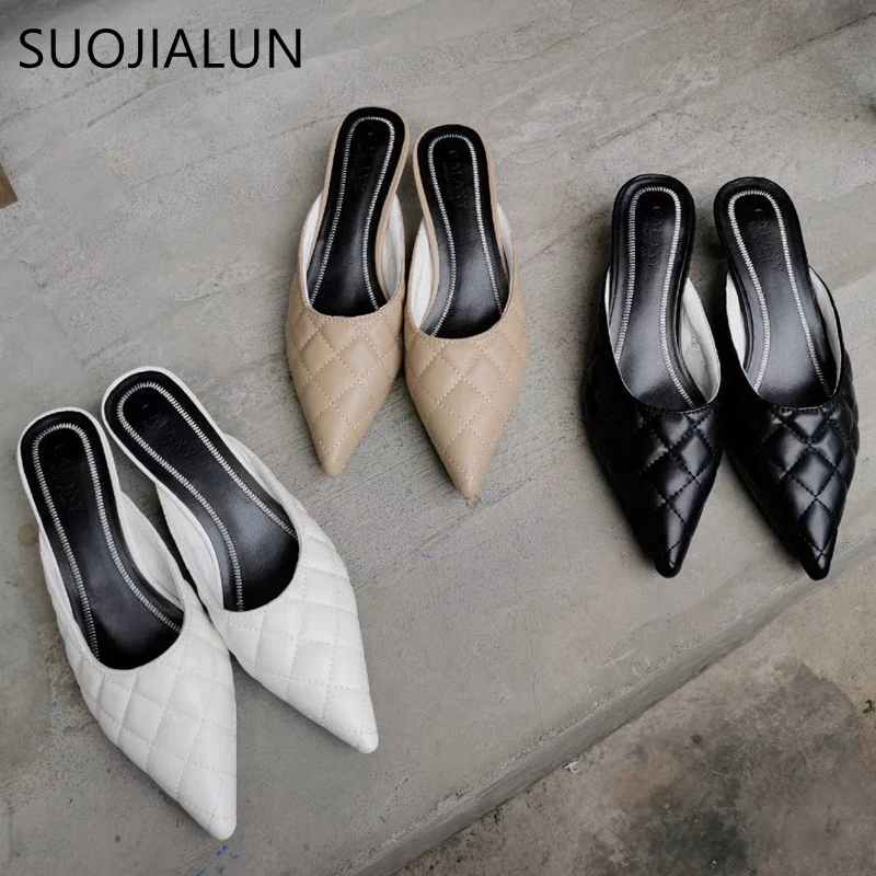 SUOJIALUN/тапочки на тонком низком каблуке; босоножки без застежки с острым носком; брендовые элегантные туфли без задника с вышивкой; обувь для улицы; шлепанцы