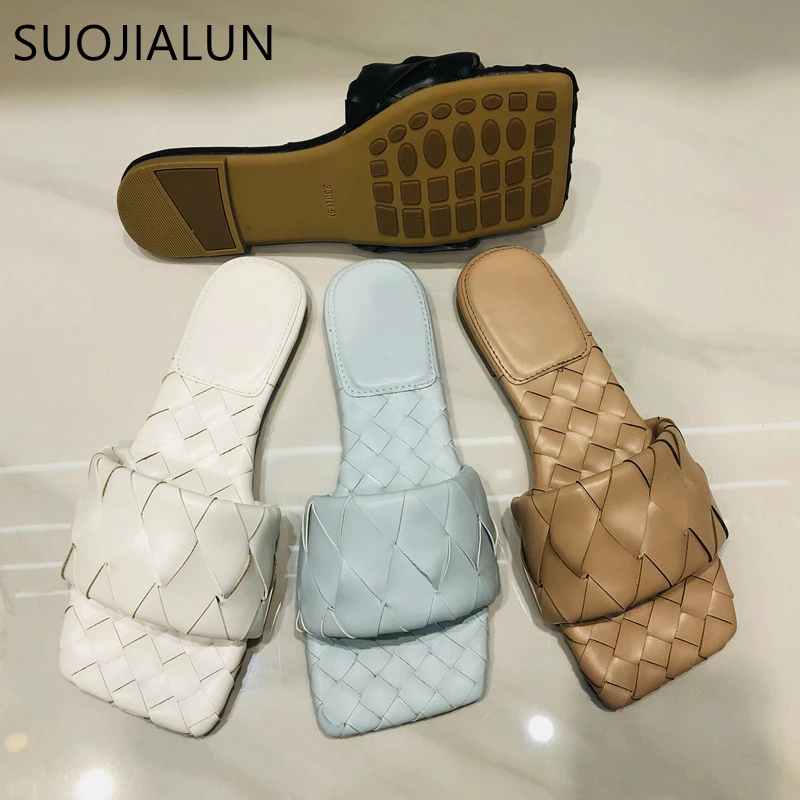 SUOJIALUN/Новинка 2020 года; летние тканые тапочки; фирменный дизайн; шлепанцы без застежки; пляжные повседневные шлепанцы на плоской подошве; сандалии с открытым носком