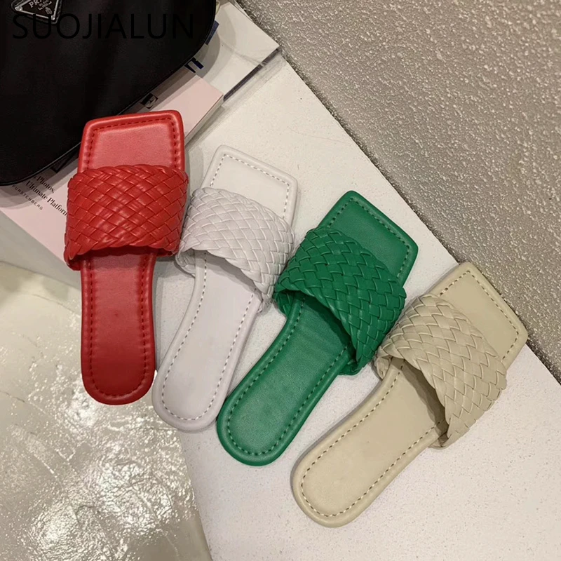 SUOJIALUN/модные тапочки с квадратным носком; Фирменный дизайн; Вьетнамки; Пляжные сандалии; Летняя Уличная обувь на плоской подошве; Повседневные шлепанцы