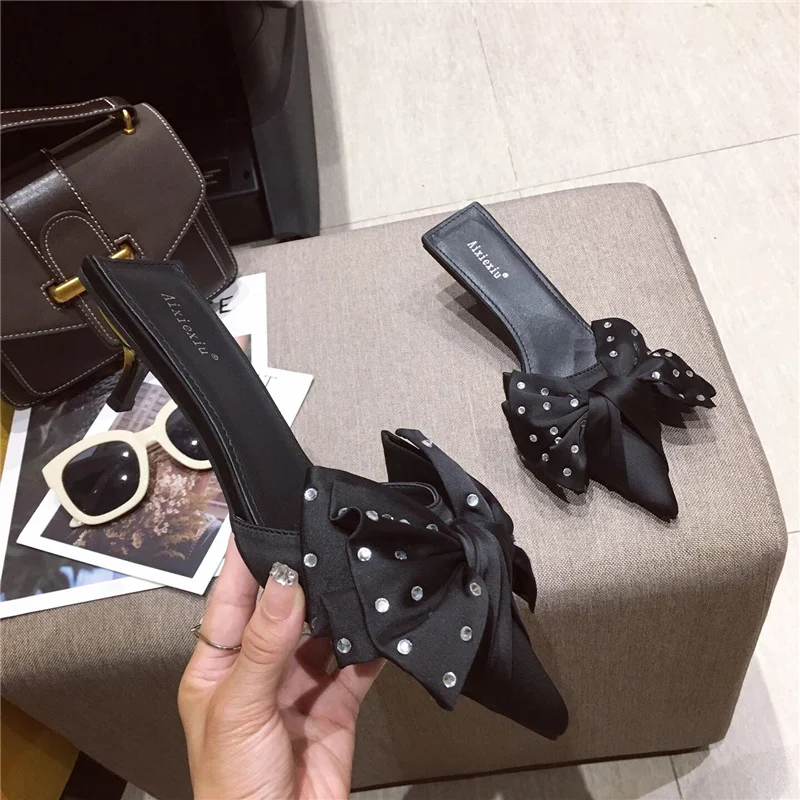 Летние дизайнерские женские шлепанцы на низком каблуке черного и золотого цвета; Шлепанцы с закрытым носком и кристаллами; Шлепанцы с бантиками; Оптовая продажа обуви; 2020