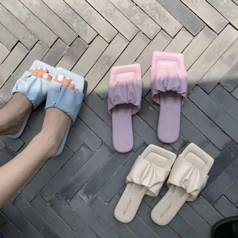 Bailehou/брендовые плиссированные шлепанцы; Модель 2020 года; Шлепанцы на мягкой подошве с квадратным носком на плоской подошве; Женские летние пляжные сланцы; Женские шлепанцы для улицы