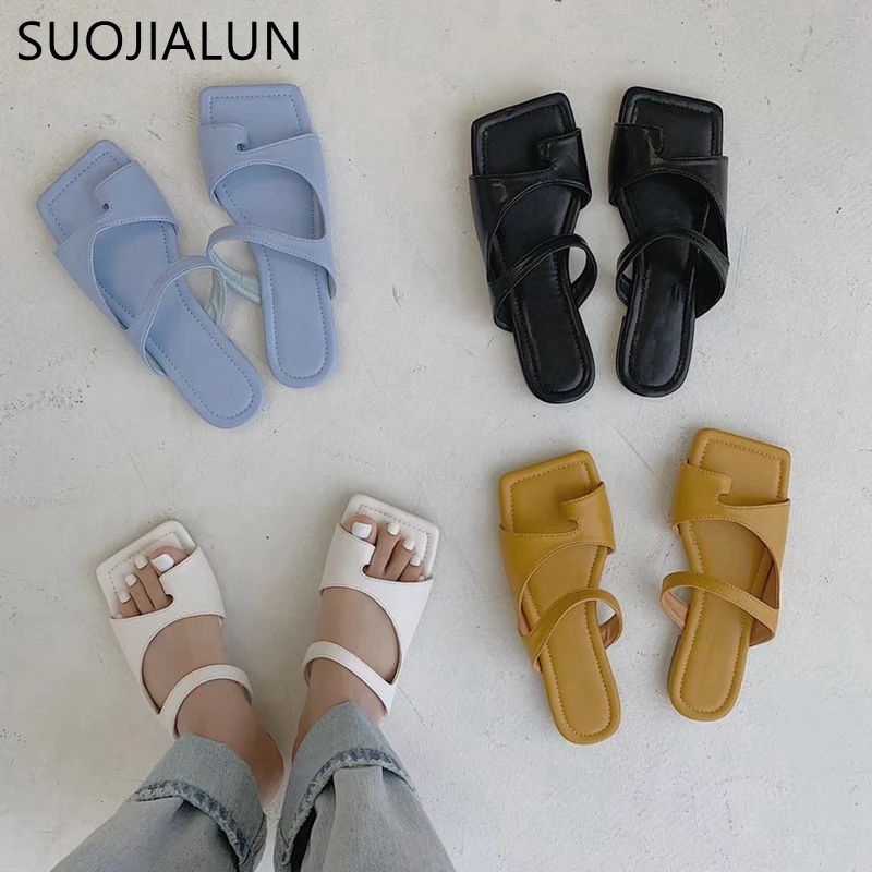 SUOJIALUN/фирменный дизайн 2020 года; Женские шлепанцы с квадратным носком на плоской подошве; Летние пляжные шлепанцы на мягкой подошве; Женские уличные шлепанцы