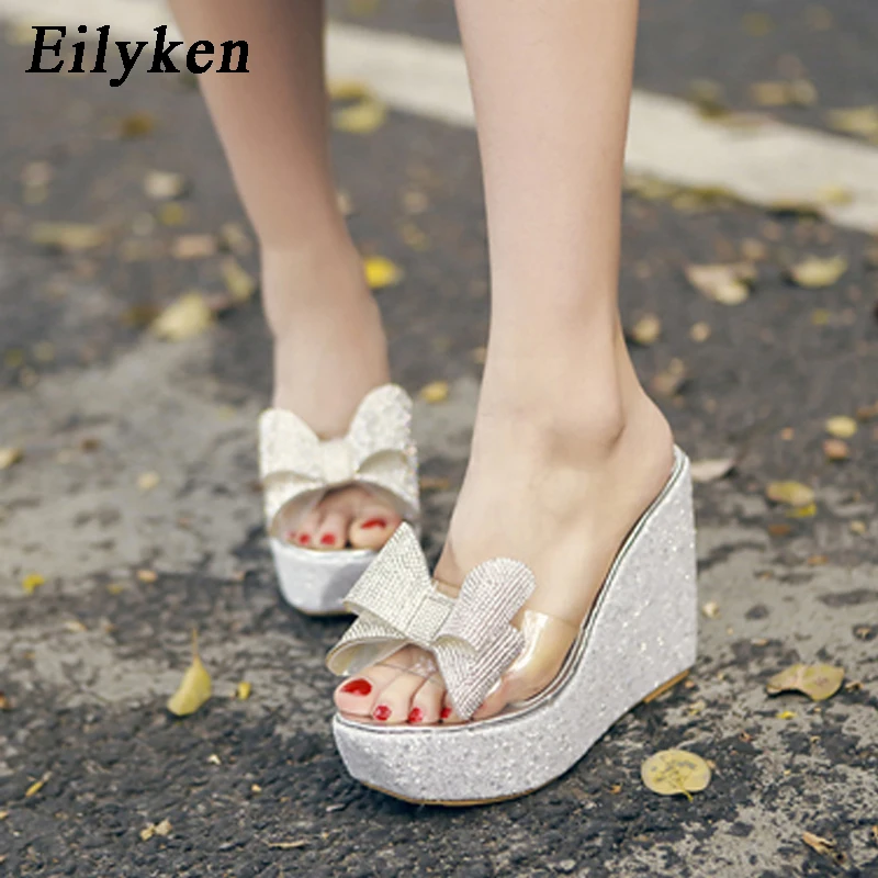 Eilyken 2019 Новый ПВХ прозрачные тапочки Для женщин летние носком платформы лук кристалл слайд клин тапочки Размеры 34–40