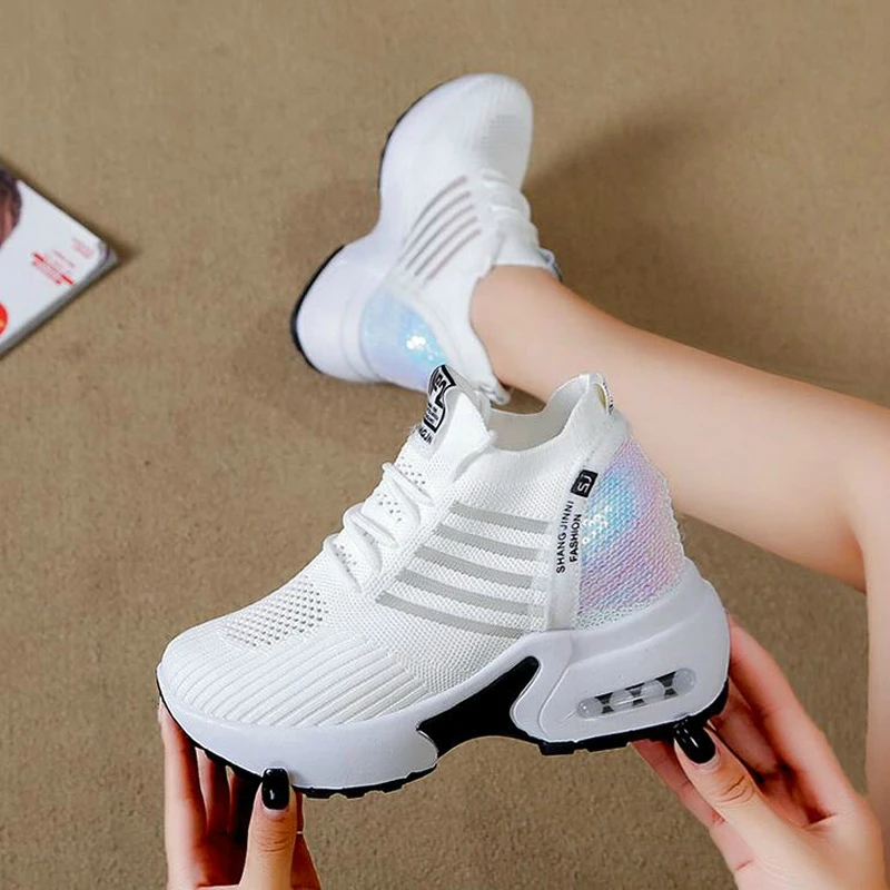 Новинка; модные вязаные кроссовки; женская повседневная обувь на скрытом каблуке; женские дышащие кроссовки на платформе; Белая обувь на та...