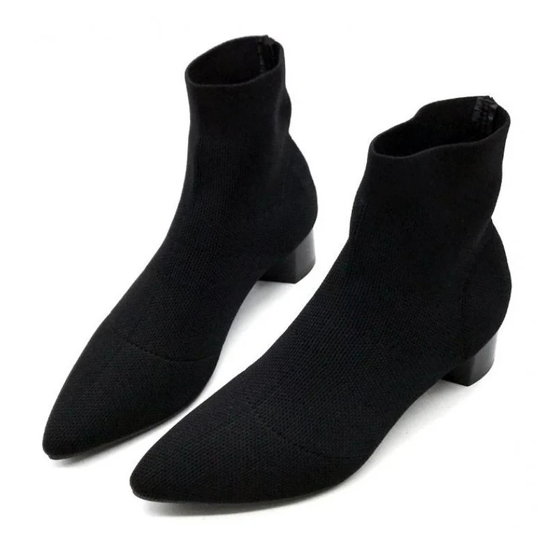 Женские ботинки с острым носком, эластичные ботильоны из пряжи, обувь на толстом среднем каблуке, женские носки, ботинки, осень 2018