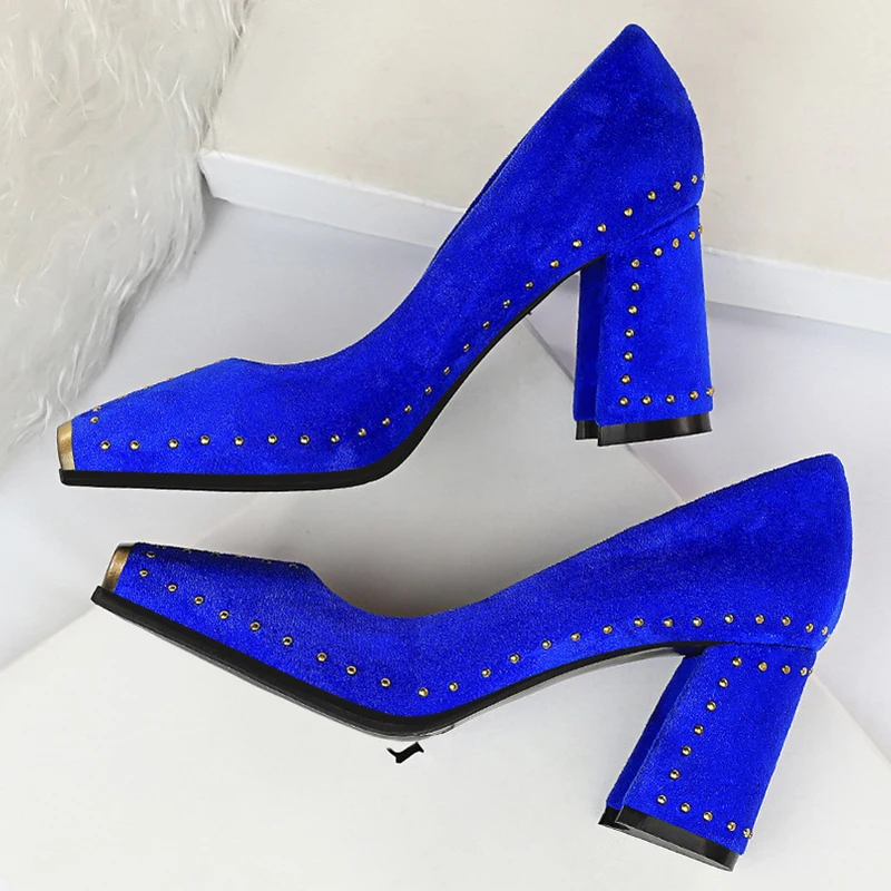 2020 женские туфли на высоком каблуке 7,5 см; Escarpins; женские туфли на массивном каблуке с заклепками; офисные туфли на низком квадратном каблуке с квадратным носком; цвет синий, желтый; туфли с шипами