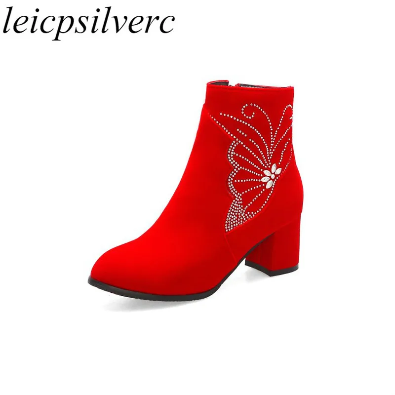 Для женщин сапоги осень-зима теплые ботинки на высоком каблуке, из флока, круглый носок, на молнии, с украшением в виде кристаллов; Туфли-челс...