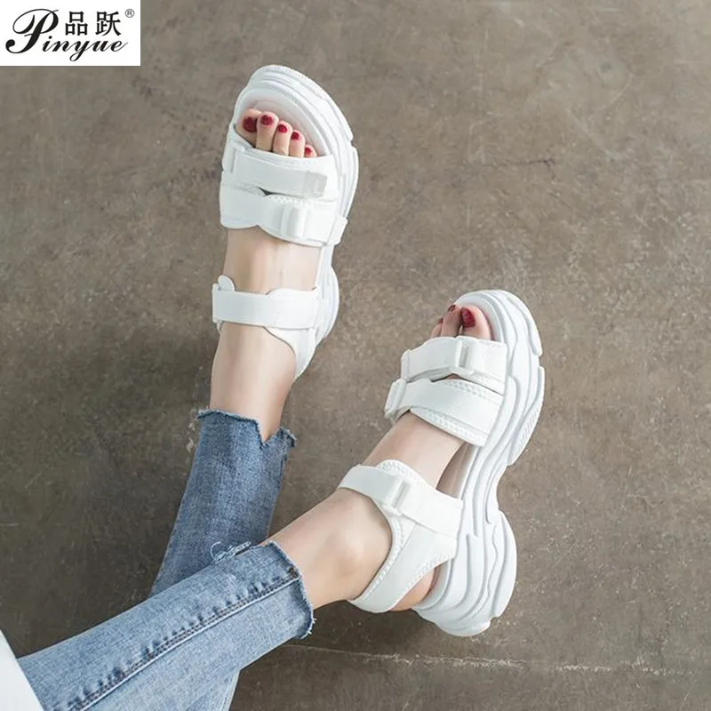 Спортивные сандалии; женская обувь на платформе; женская обувь на среднем каблуке с толстой подошвой на липучке; модная повседневная Летняя обувь черного цвета
