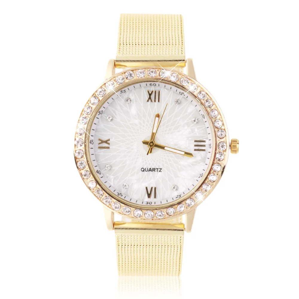 Женские Кристальные круглые кварцевые наручные часы из нержавеющей стали с сетчатым ремешком, подарок с золотым цветом, Relogio Masculino 2019