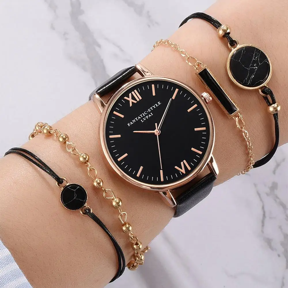 Набор часов для женщин, 5 шт., Женские кварцевые наручные часы, кожаный дамский браслет, роскошные часы, повседневные часы, подарок для девушки
