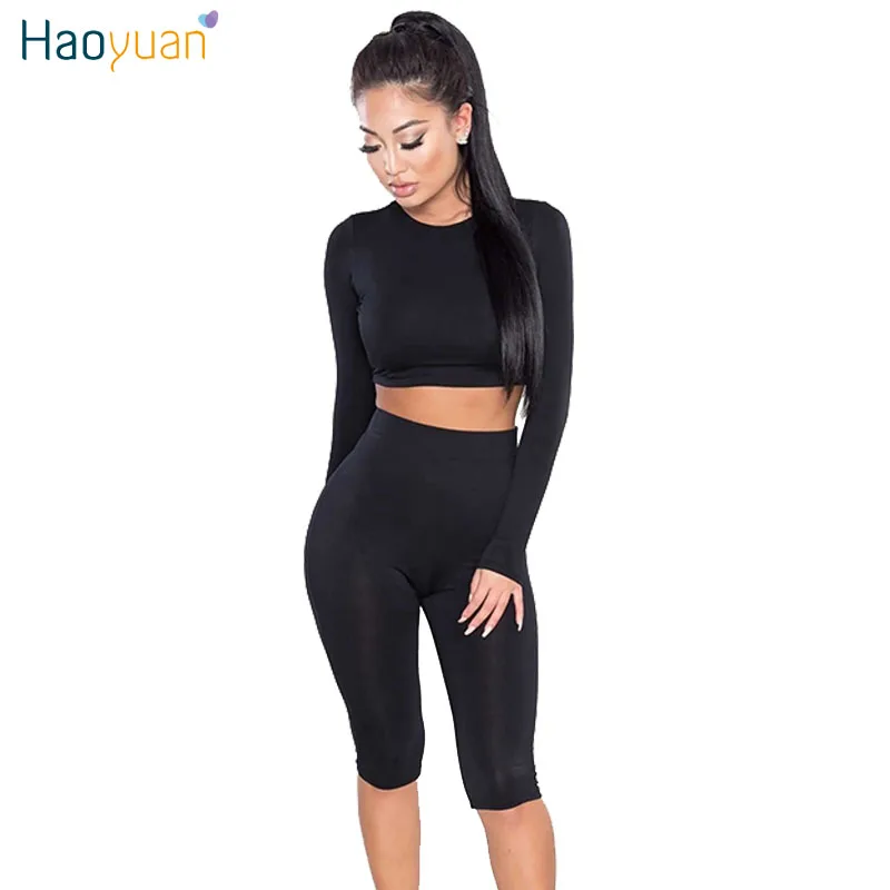 HAOYUAN комплект из 2 частей для женщин пикантные топ с длинными рукавами + байкер шорты для спортивный костюм спортивный костюм-боди повседнев...