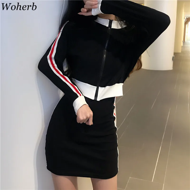 Simenual Повседневное стильный полосатый Верхняя одежда из двух частей Для женщин топ с длинными рукавами и мини-юбка комплекты 2020 белого цвета в комплекте с набором подходящих сумочек