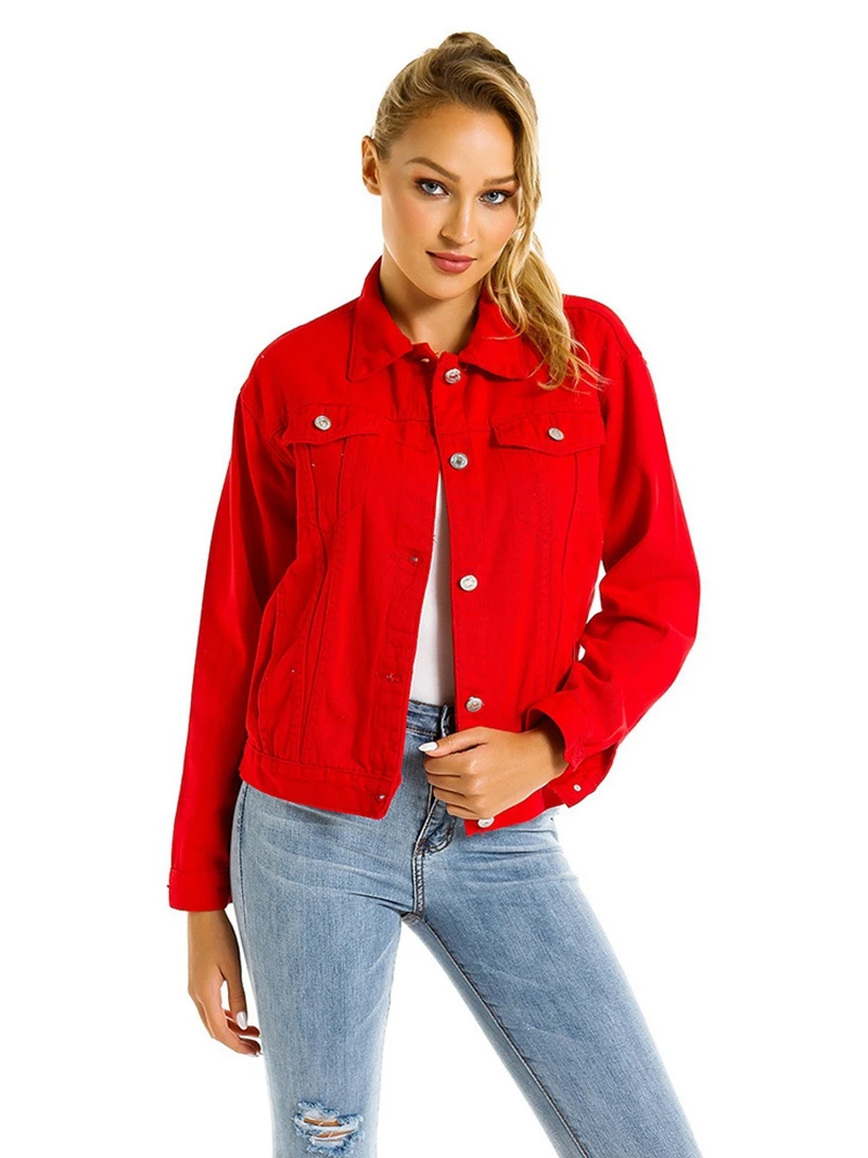 Красная однобортная джинсовая куртка на пуговицах спереди, пальто для женщин, Осень-зима 2019, уличная одежда с карманами, Повседневная Свободная верхняя одежда для женщин