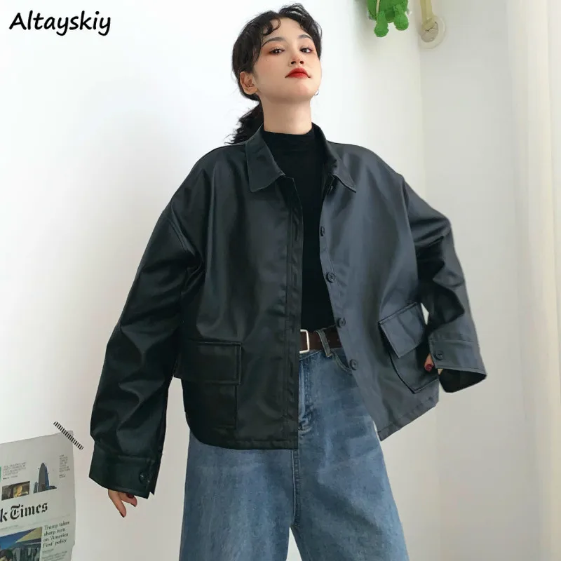Женские куртки из искусственной кожи с карманами на пуговицах, ветровка с отложным воротником в Корейском стиле BF Ulzzang 2020