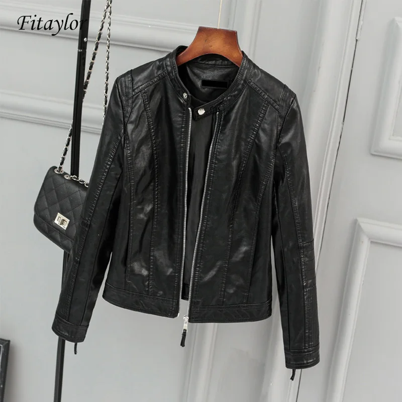 Fitaylor Новая женская куртка из искусственной кожи байкерское пальто весна осень черная верхняя одежда на молнии с круглым вырезом тонкая мот...