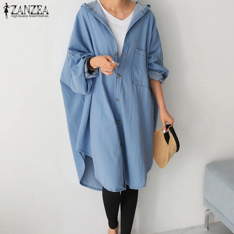 ZANZEA женские джинсовые синие куртки осенние толстовки с длинным рукавом тонкие пальто повседневные пуговицы Длинная Верхняя одежда свободный однотонный кардиган