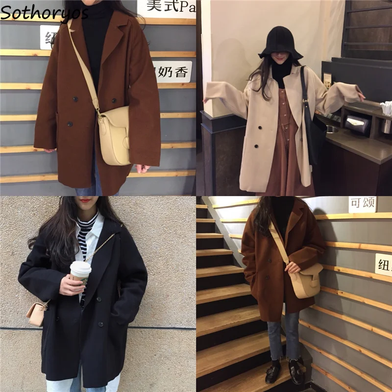 Смеси Для женщин осень двубортный длинные карманов Досуг сплошной универсальные корейский стиль пальто Для женщин s свободные Мода простой...