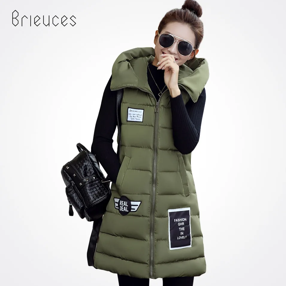 Женский жилет Brieuces, теплая длинная куртка без рукавов с капюшоном на осень и зиму, Colete Feminino размера плюс 4XL