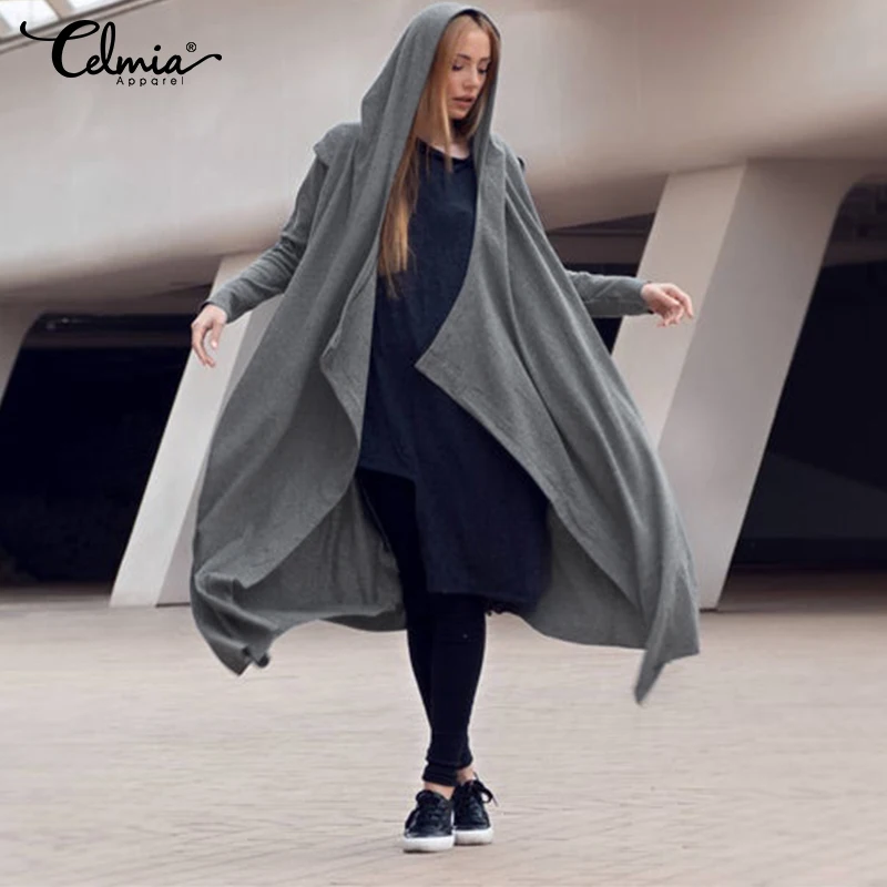 Модные Асимметричные пальто для женщин, винтажные Длинные куртки с капюшоном, 2019, Женская Повседневная Свободная трикотажная верхняя одежд...