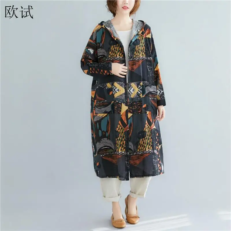 Длинный плащ с капюшоном размера плюс, весна 2020, для женщин, с принтом граффити, Повседневный Кардиган, хлопок, лен, пальто, одежда, ветровка