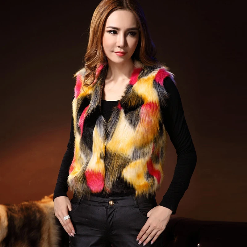 Hongzuo Новинка 2017 Для женщин Цвет ful Искусственный мех жилет Лоскутная постепенное Цвет Мода Тонкий рукавов Мех животных жилет женский пиджак ...