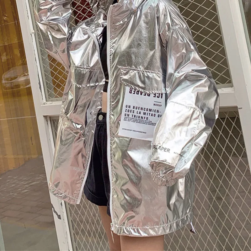 2020 Весенняя женская куртка с капюшоном, флуоресцентная, в стиле хип-хоп, с длинным рукавом, тонкая, женская, летняя, розовая, черная, свободная, серебряная, Женская куртка