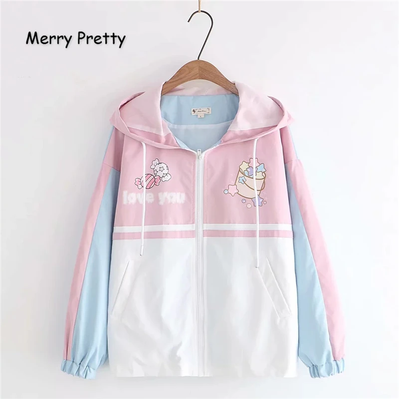 Merry Pretty женский мультфильм узор контрастные цвета Базовая куртка 2019 зима длинный рукав с капюшоном куртка повседневная молния верхняя одеж...