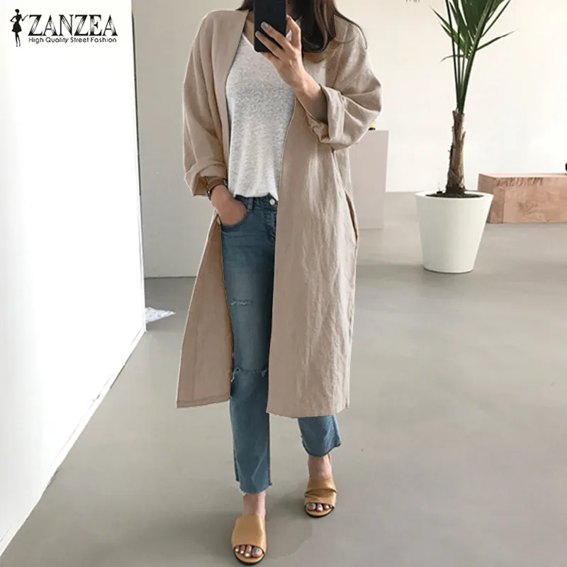 2019 осенний однотонный хлопковый длинный кардиган ZANZEA женское пальто с длинными рукавами Повседневная винтажная верхняя одежда с открытыми...