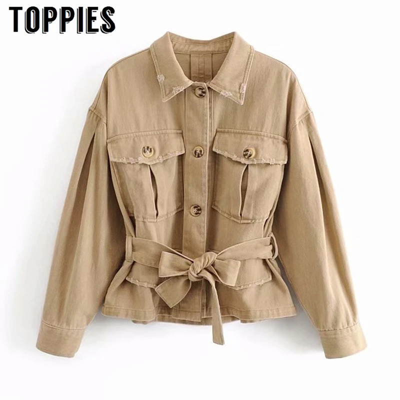 Хаки рваные рваная джинсовая куртка женская джинсовая куртка однобортный Пояс Талия пальто осень 2019 американская европейская одежда