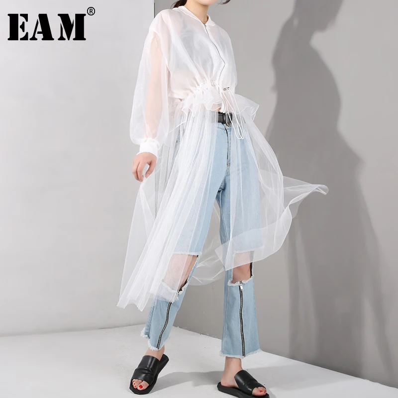 [EAM] 2019 Новинка весна лето Стенд воротник с длинным рукавом белая сетка шнурок большой размер ветровка Женский Тренч Мода JU1880