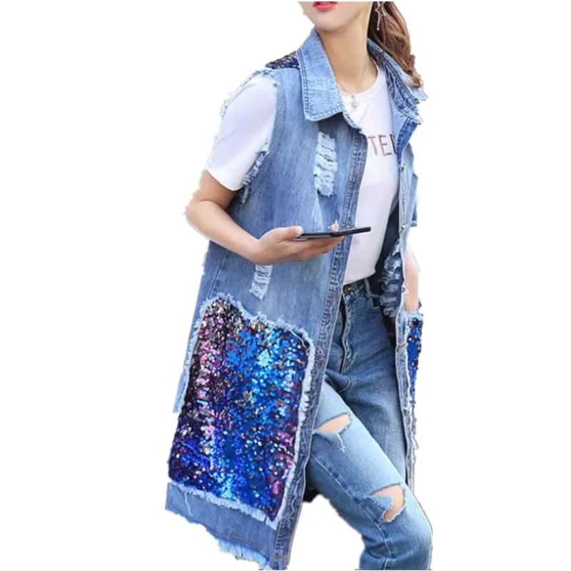 2018 Новая коллекция Весна блестками длинный жилет женщины отверстие джинсовый жилет куртка свободные размер xxxl темно-синий