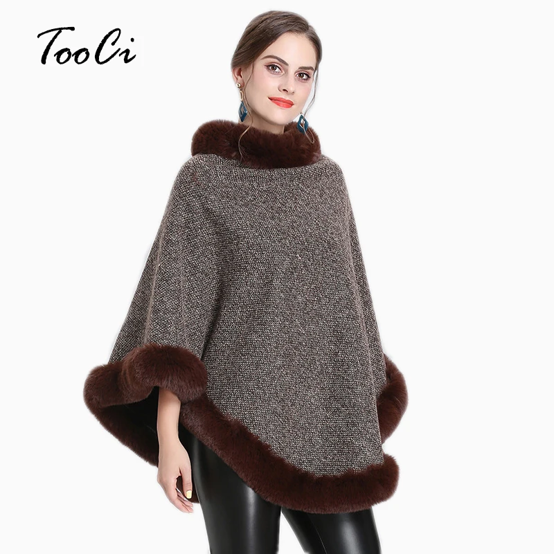 Новые весенние женские кейпы пончо из искусственного лисьего меха хаки шаль вязаный треугольный меховой свитер размера плюс пуловер пальто меховой воротник