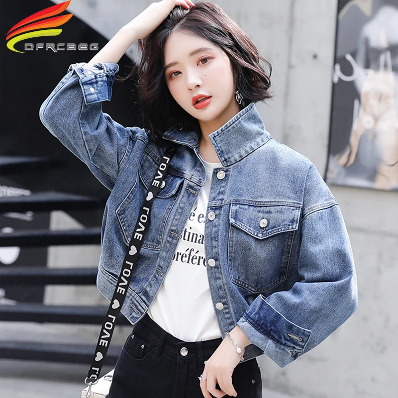 Джинсовая куртка женская 2020 Весна Длинный рукав отложной карманы джинсовые куртки и пальто короткие большие карманы обрезанная джинсовая куртка