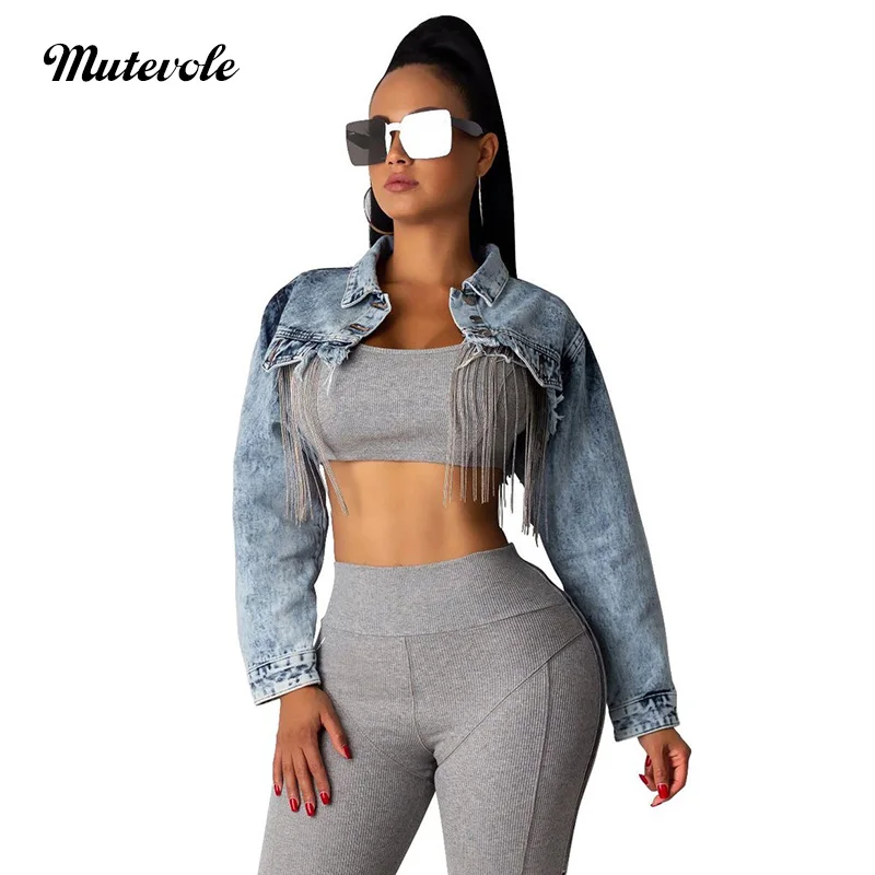 Mutevole Для женщин Повседневное дополнительная короткая джинсовая куртка с длинными рукавами на осень с кисточками куртка на пуговицах, с отл...