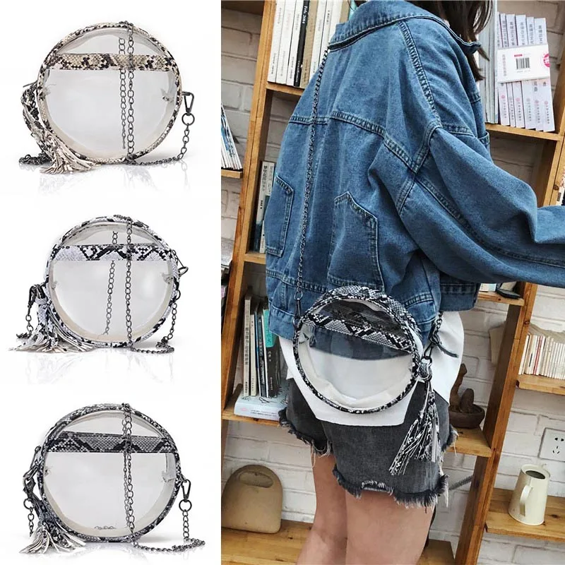 Женская прозрачная сумка через плечо из змеиной кожи, Круглый прозрачный кошелек, сумка на плечо с кисточкой, Новинка