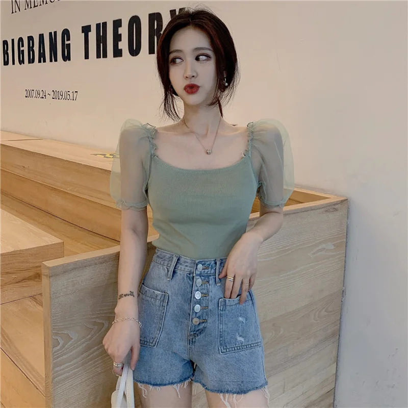 Модные топы с короткими рукавами из слоеной пряжи, короткий дизайн, Женские топы для девочек, Летняя трикотажная футболка с вырезом, тонкие ...