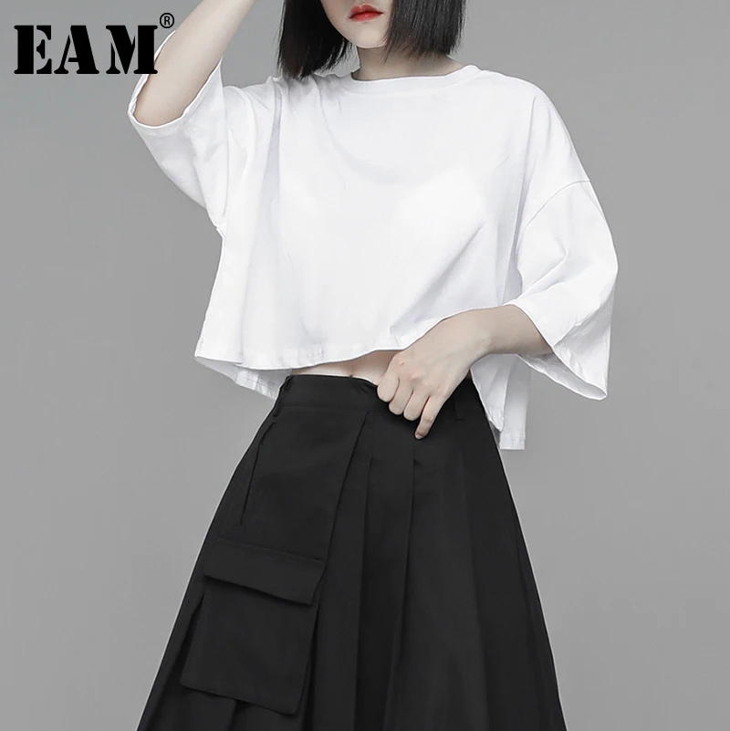 Женская футболка EAM, белая однотонная хлопковая Футболка большого размера с коротким рукавом и круглой шеей, весенне-летняя мода 2020 1U328