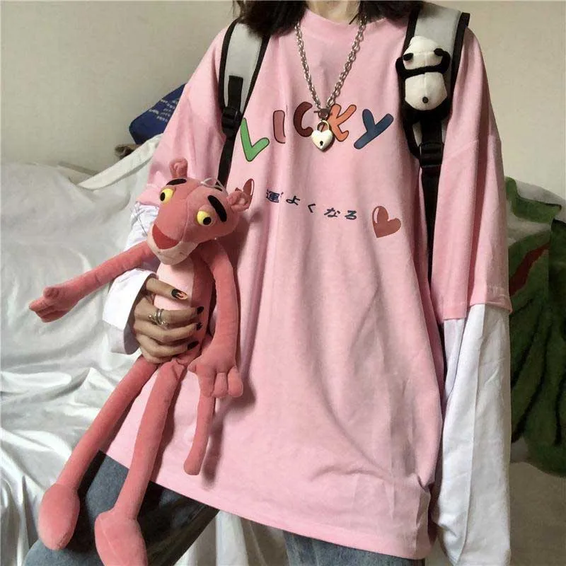 Лоскутное контрастное с длинным рукавом графическое японское письмо любовь милый Принт Kawaii свободная футболка Женская Корейская Студенче...