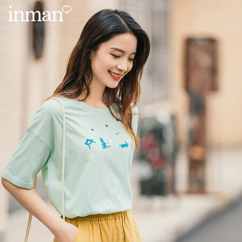 Футболка с коротким рукавом, универсальная, свободная, с забавным принтом кота, для студентов, для отдыха, inman, 2020