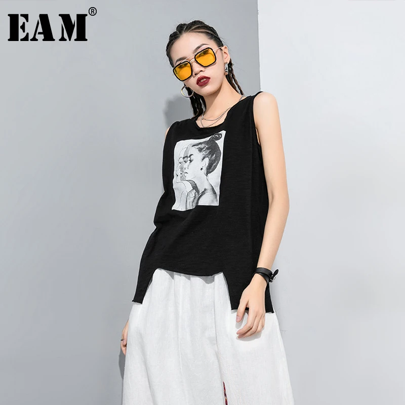 [EAM] Женская Черная Асимметричная футболка с принтом Новая модная футболка с круглым вырезом без рукавов весна-лето 2020 1T305