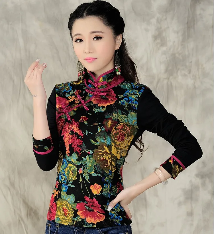 KYQIAO 2019 винтажная рубашка этнический дизайн Мандарин воротник длинный рукав черный цветочный принт рубашка женская традиционная китайская ...
