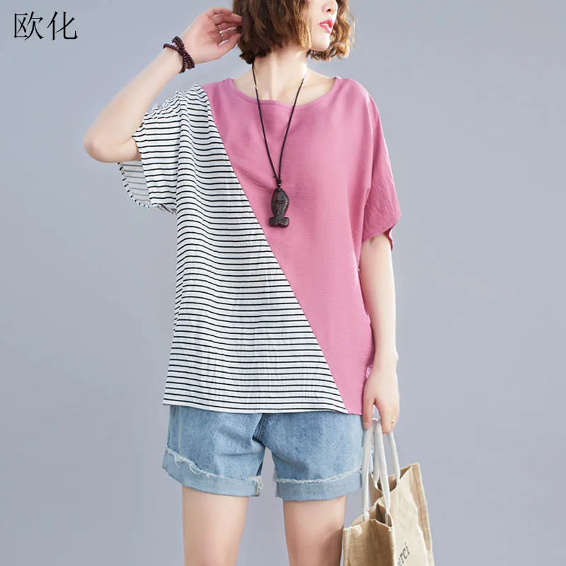 Женская футболка с круглым вырезом, Винтажная футболка в полоску из хлопка и льна, большие размеры, лето 2020