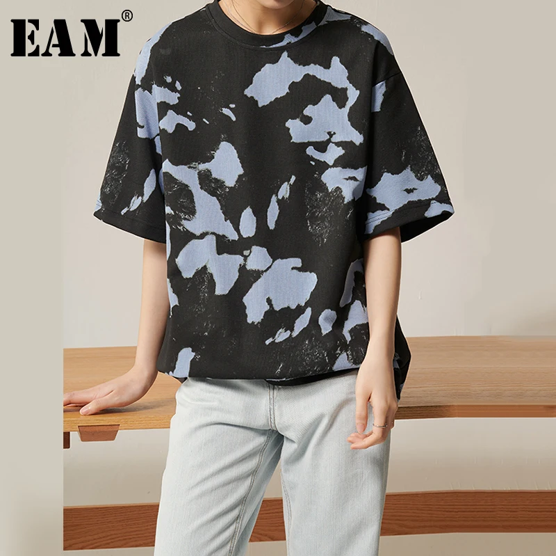[EAM] Женская Черная футболка с принтом, новая модная футболка с круглым вырезом и рукавом три четверти, весна-лето 2020, 1S945