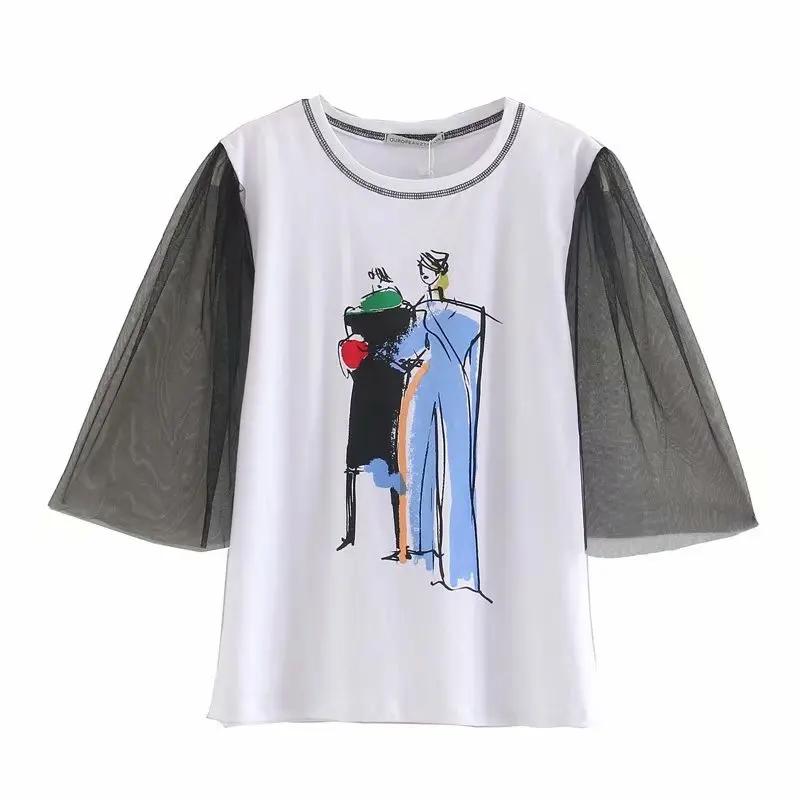 Новинка, женская черная Повседневная футболка в стиле пэчворк с сетчатым рукавом и абстрактным принтом, Женская Базовая белая футболка с круглым вырезом, топы в стиле ретро, T602