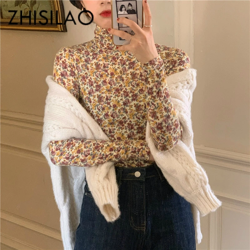 Водолазка с цветочным рисунком, женская футболка с длинным рукавом, Женская винтажная элегантная женская футболка, весна-лето 2020, Повседнев...