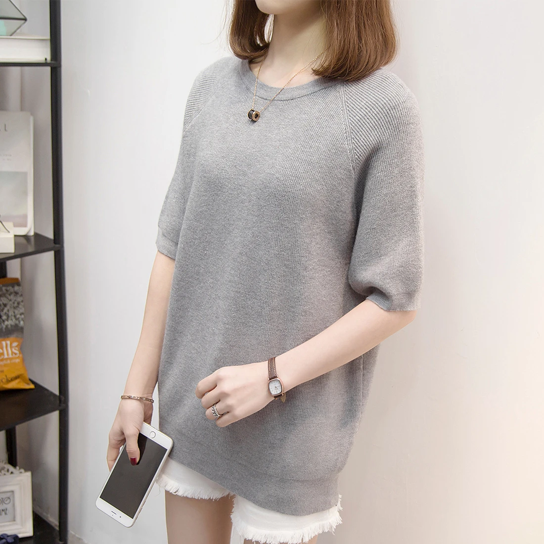 Женские вязаные топы размера плюс, весна-лето 2020, Модные свободные футболки с коротким рукавом, одноцветные футболки, Корейская вязаная одежда