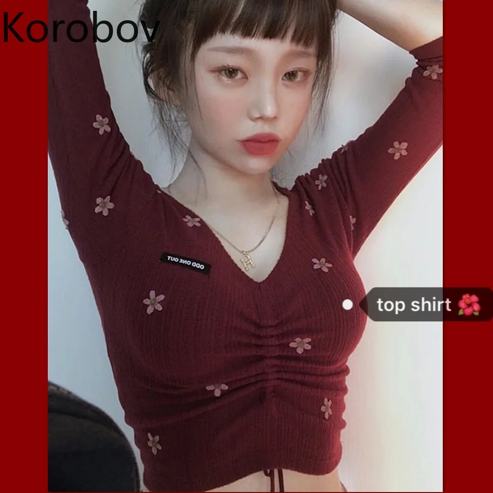 Korobov Милая женская футболка с цветочной вышивкой, корейский топ с v-образным вырезом, женские футболки с коротким рукавом и завязками 78100