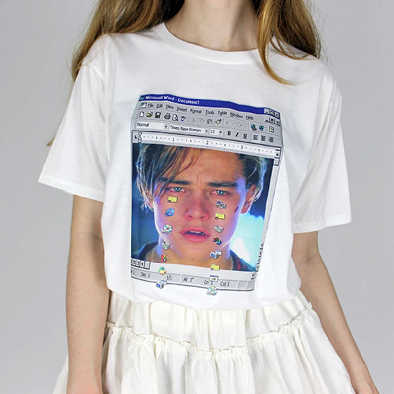 Горячая Tumblr Ulzzang Летняя женская футболка Leonardo di caprio Leo Titanik плач harajuku Повседневная однотонная белая женская большие размеры Топы