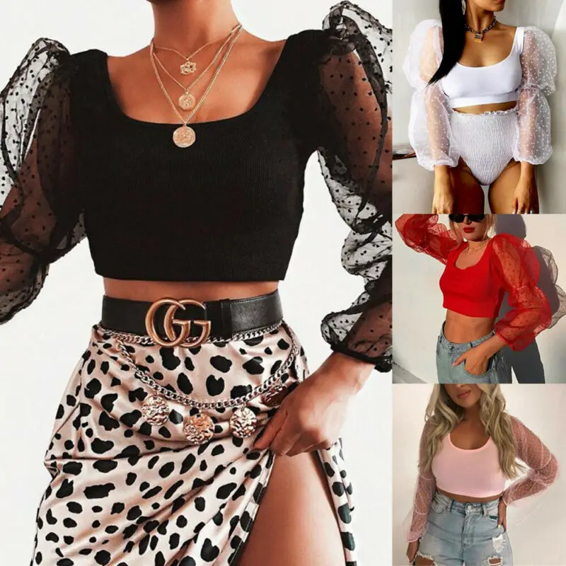 Женский прозрачный топ в горошек с сеткой, сказочный женский пышный топ с длинными рукавами, сетчатый хомут, однотонный свободный тонкий мя...