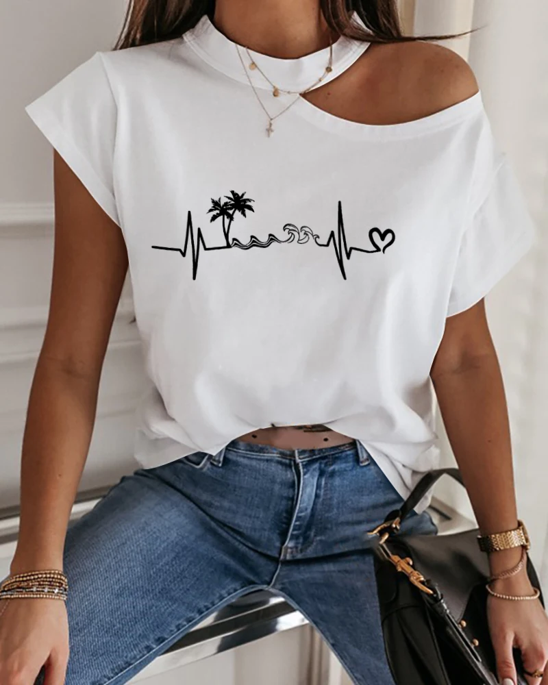 Летняя женская футболка с вырезами на плечах, стильная, шикарная Базовая футболка с принтом сердца, футболка с короткими рукавами и принтом с открытыми плечами